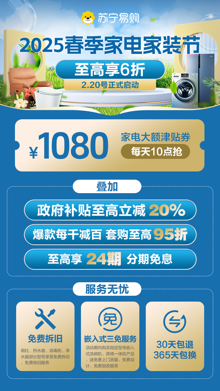 跟着装饰旺季到来,家电家居消费市场热度攀升。本日起至3月1日,苏宁易购线上正式敞开春季家电家装节,联合百大家电、家装品牌加码国补优惠,多款产品到手价低至6折。活动期间,苏宁易购推出“1080元补助券”、“百款百亿补助爆品”、“至高24分期免息”等多项让利,并晋级“免费拆旧、30天包退365天包换,嵌入式家电三免服务”等特征体会,助力用户省心焕新家。