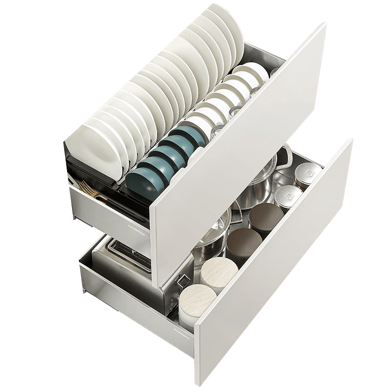 悍高厨房拉篮的双层抽屉式设计,让您的碗碟、筷勺、调味瓶等厨房用品有序摆放,提升了厨房收纳效率。您再也不需要为找不到所需的调味料而感到烦恼,所有物品都将一目了然,生活将变得更有条理。